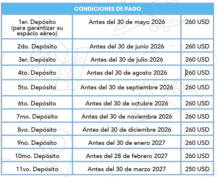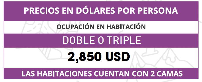 • Propinas a chóferes, guías y maleteros (20 dólares por persona se pagan directamente en el destino).